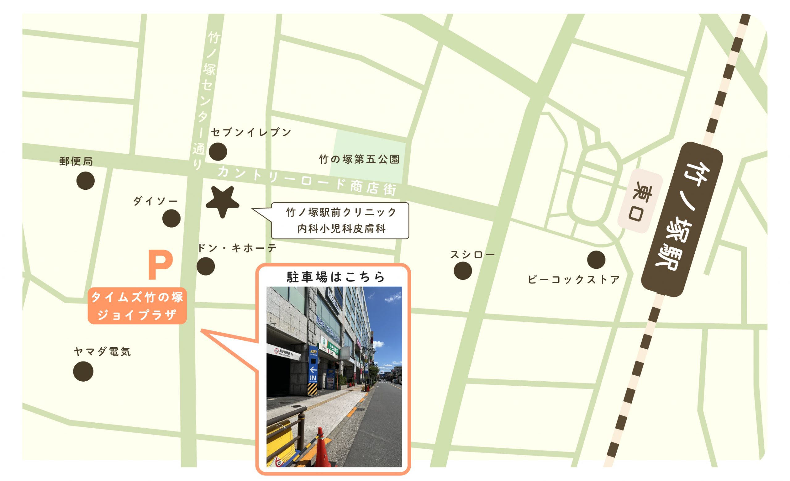 クリニック向かいのタイムズ竹の塚ジョイプラザは近隣の薬局を利用する事で薬局にて1時間無料で駐車することが可能です。